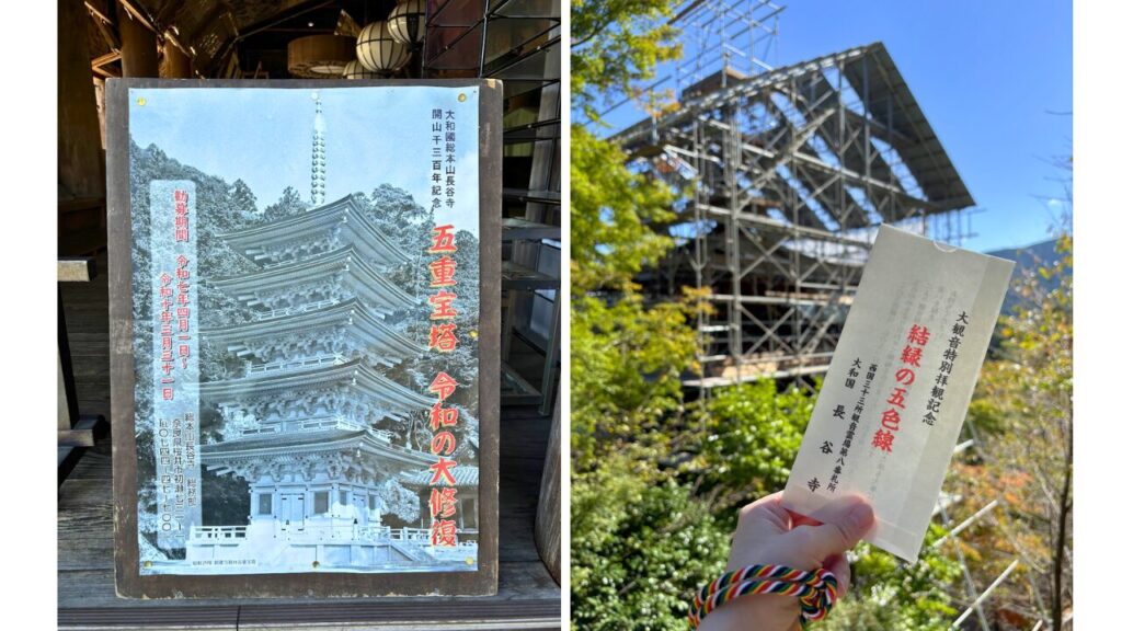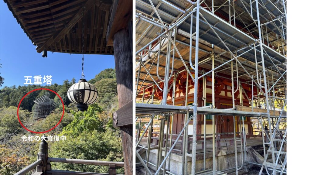 現在、長谷寺の五重塔は「令和の大修復」中で拝観は休止されています。工事の足場越しに塔の姿を少しだけ望むことはできますが、完成後には新たな美しさで再び訪れる人々を迎えてくれることでしょう。