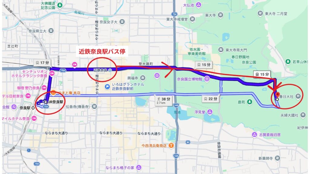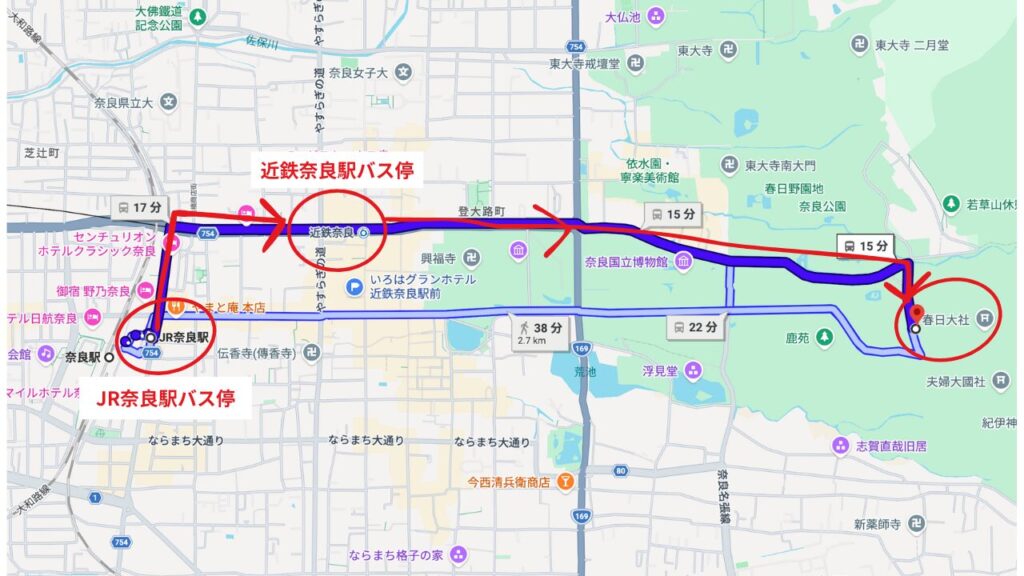 JR奈良駅から春日大社への行き方 (バス約15分+徒歩5分)