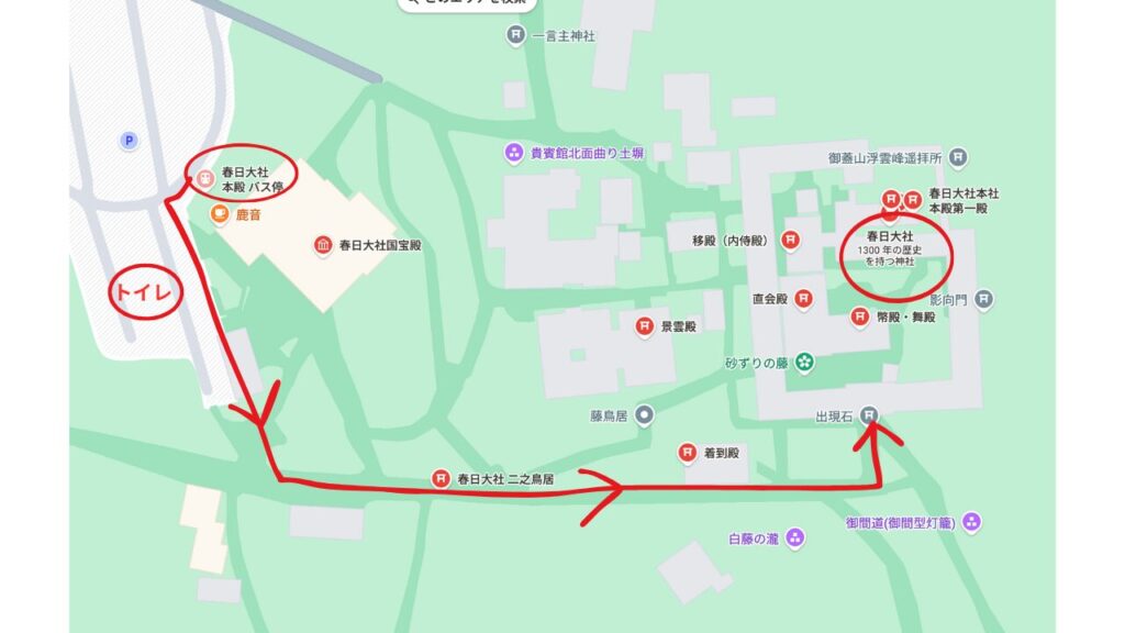 「春日大社本殿」バス停から降りたら、近くにトイレがあります。