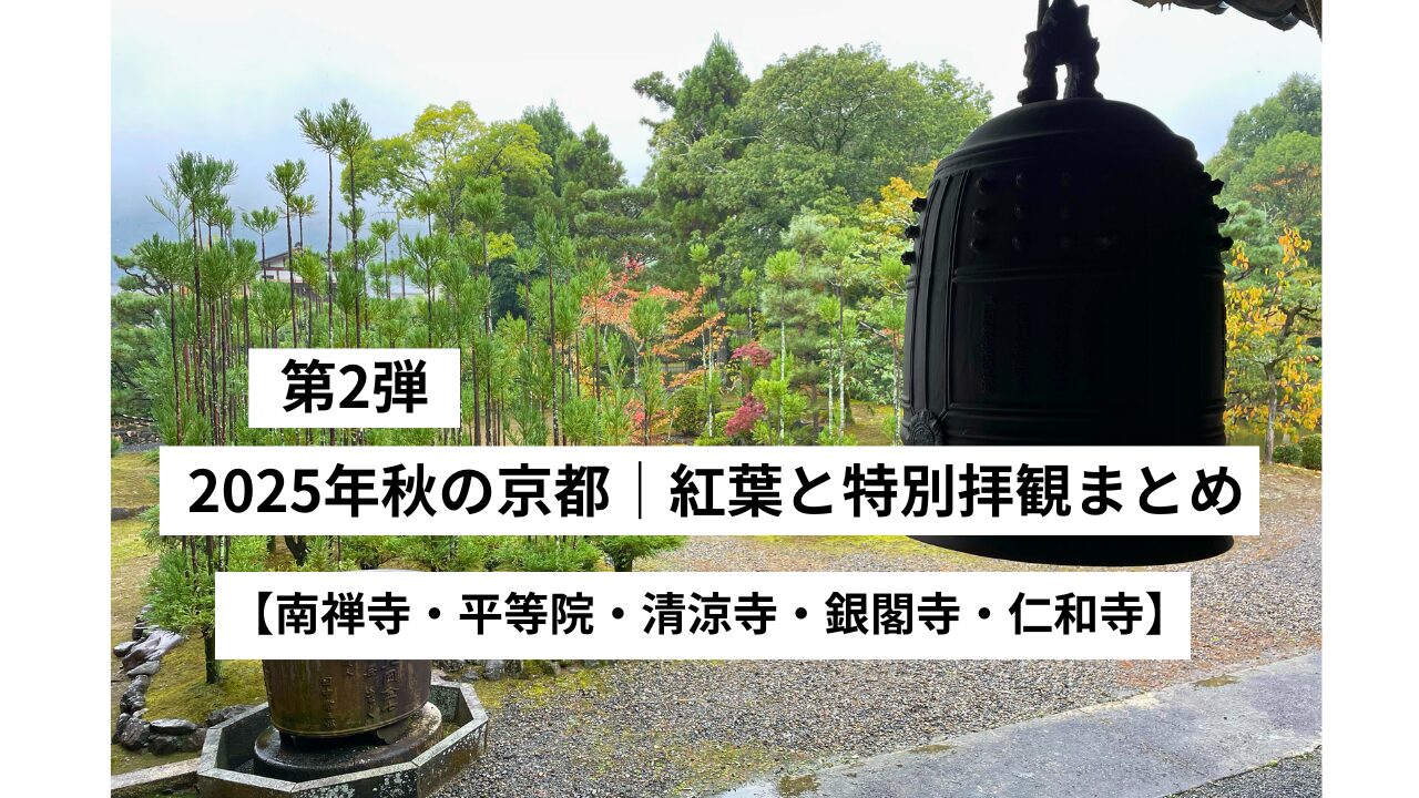 第1弾(東寺・清水寺ほか)に続き、今回は南禅寺・平等院・清凉寺・銀閣寺・仁和寺の5寺院をピックアップしました。紅葉シーズンにだけ味わえる特別拝観や夜間公開、霊宝館の秋期展示を中心に、見どころ・鑑賞ポイント・アクセス・注意点をわかりやすくまとめています。