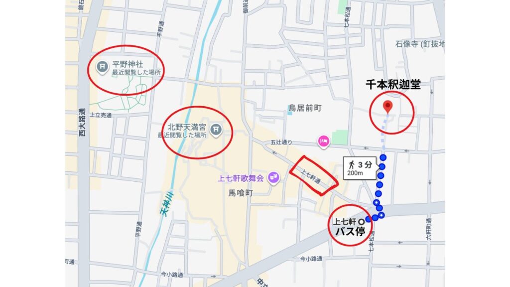 - 千本釈迦堂 → 北野天満宮:徒歩 約10〜15分