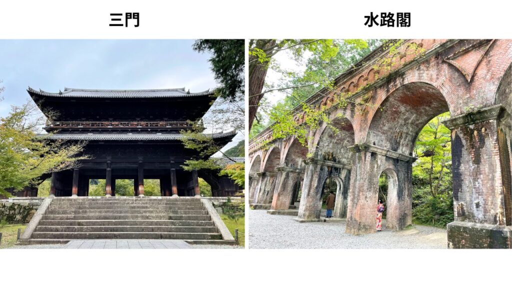 - 三門:高さ約22メートルで日本三大門の一つに数えられ、「天下竜門」とも呼ばれます。三門の上の「五鳳楼」からは京都市内の絶景が楽しめ、春の桜や秋の紅葉の名所でもあります。