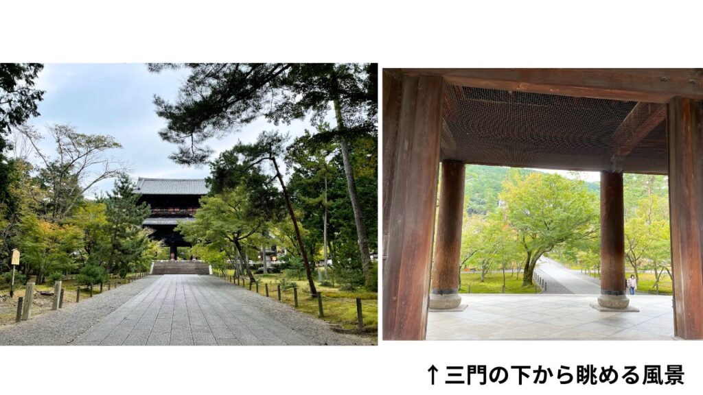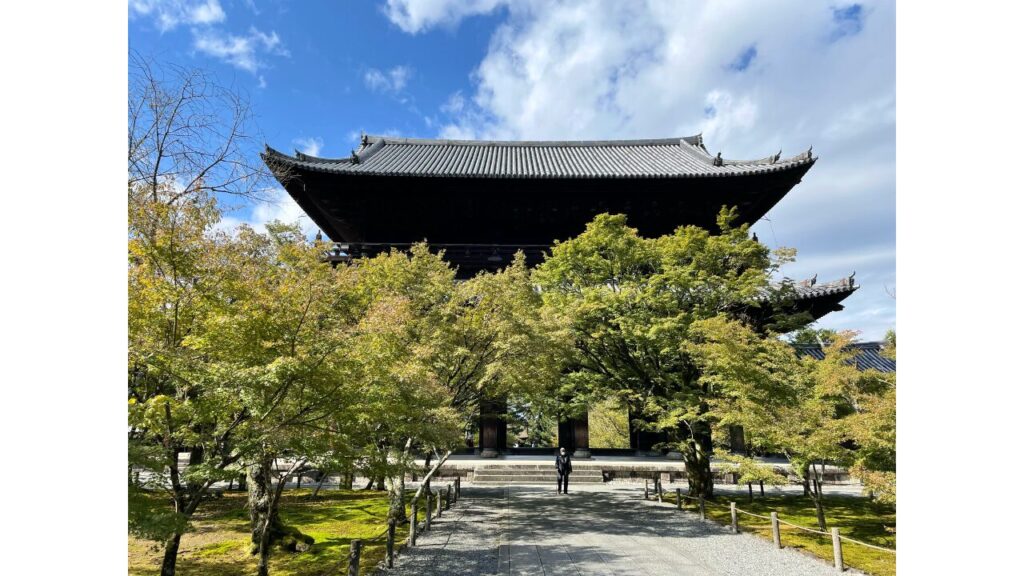 南禅寺は紅葉の名所としても名高く、特に法堂の周辺や水路閣の近くでは赤や黄色の彩りが境内を包み込みます。堂宇の白壁や木々の緑とのコントラストが美しく、歩いているだけで心が解きほぐされていくようでした。