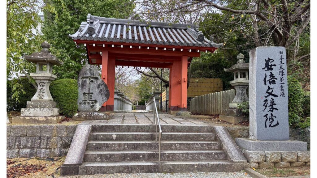 朱の合格門を抜け、階段を上がると、文殊院全体を一望できます。