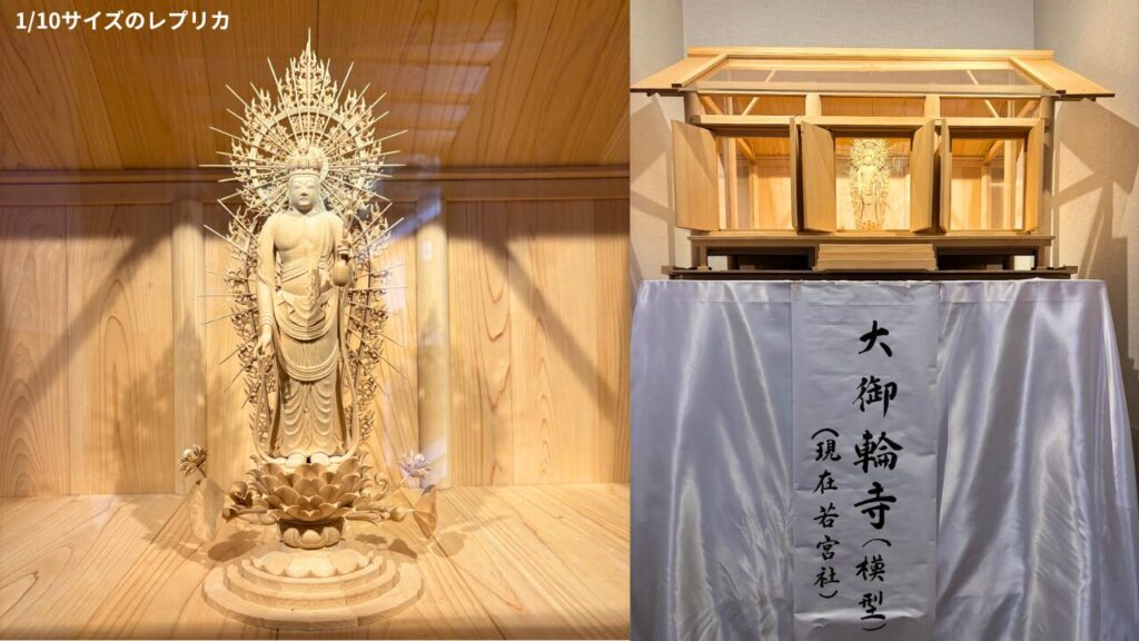 観音さまは、2022年に耐震改修を終えた最新の展示環境のもと、反射を抑えたガラスケースの中央に安置されています。 照明の加減も絶妙で、光がやさしく衣のひだを照らし出していました。堂内を一周しながら拝見できる展示方法も魅力で、背面の衣の線まで美しく整えられています。