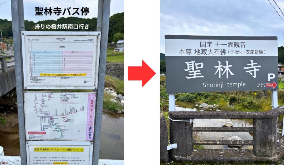 私は近鉄・JR桜井駅前の奈良交通バス「桜井市コミュニティバス」に乗り、「聖林寺」で下車しました。バス停のすぐの橋に案内看板が見えるので、迷うことはありませんでした。