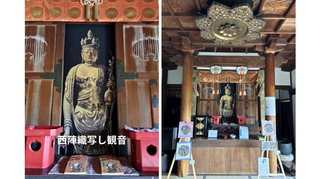 本堂は江戸時代中期、中興第6世・大桂によって建立されました。堂内は静かで落ち着いた空間で、フェノロサ寄贈の厨子なども安置されています。その厨子内に、西陣織で制作した十一面観音菩薩をお祀りしています。平安時代からの手法で十二色の糸で織られています。(西陣織写し観音 再現)