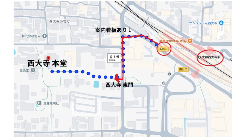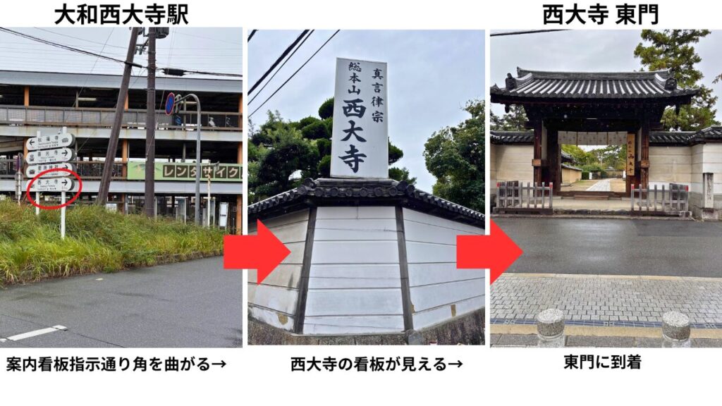 降りたら、徒歩数分で西大寺の入口(案内看板) が見えてきます。