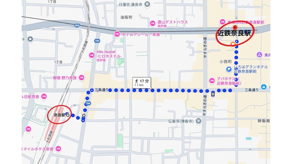 - JR奈良駅 → 近鉄奈良駅へ徒歩移動(約17分)※バスもあり