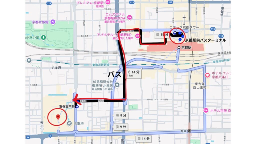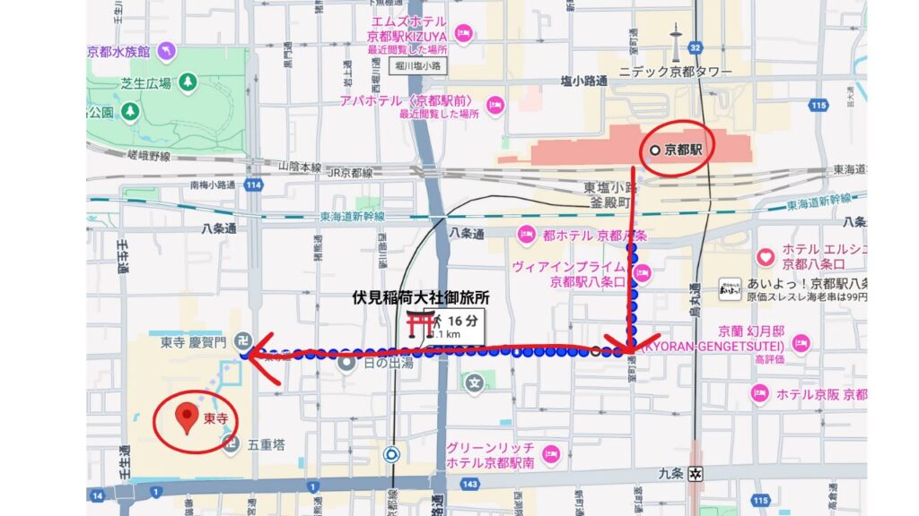 京都駅(八条口・南口)から徒歩約20分。駅を出て西方向へ進むと、正面に五重塔が見えてきます。